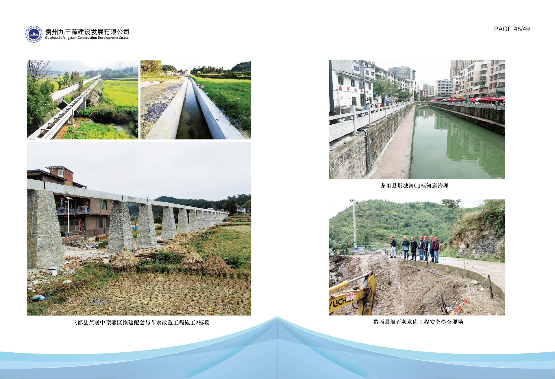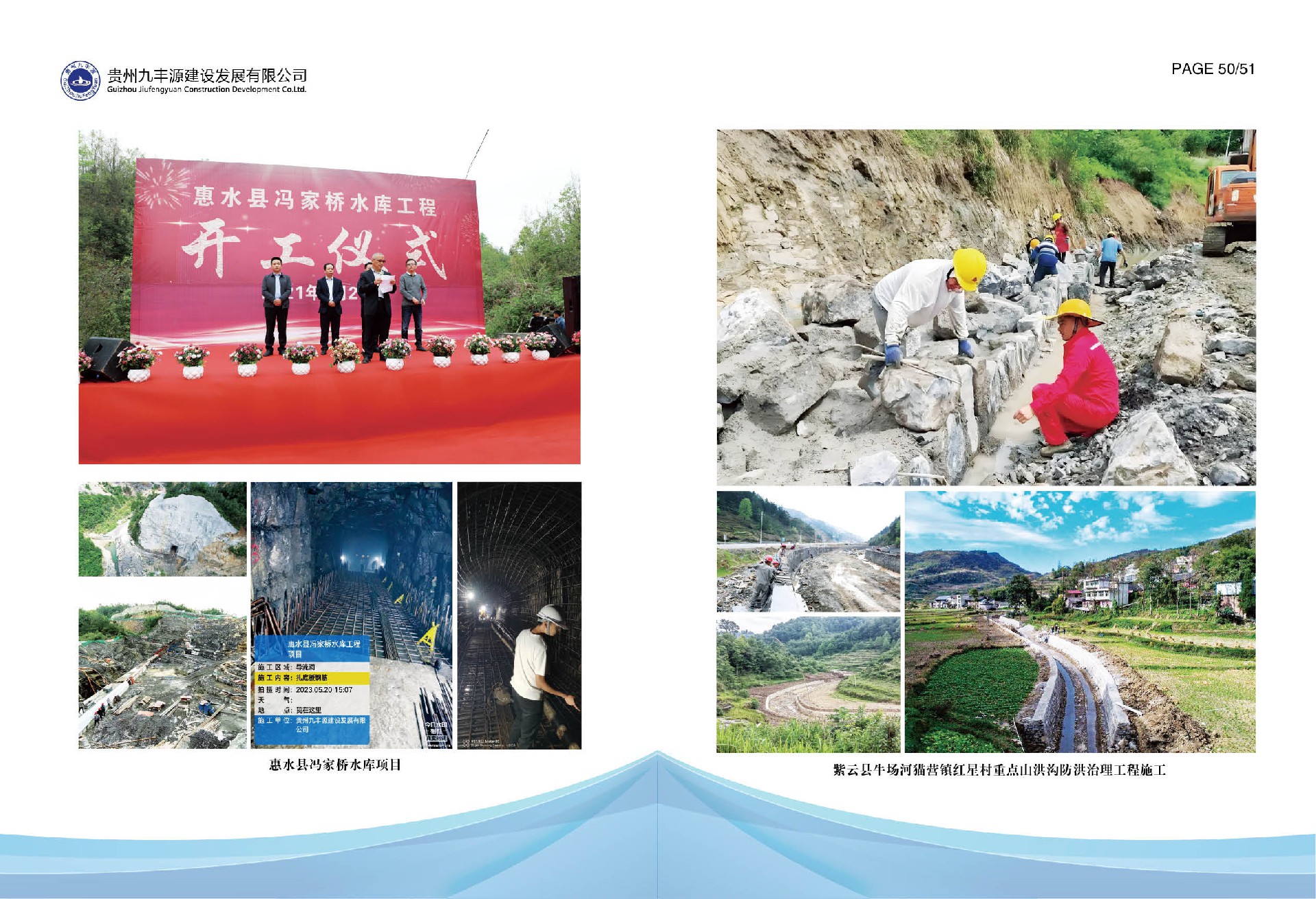 公司团队成员曾全过程参与了省内外多个重点工程施工建设,主要业绩有:青海龙羊峡水电站、我国最高抛物线双曲拱坝贵州东风水电站系统工程、湖北朝阳寺水电站系统工程、浙江温州赵山渡水利枢纽、河北丰宁水电站系统工程(厚覆盖砂砾石层砂砾石面板堆石坝)、浙江温州文成县高山水电站(抛物线双曲拱坝)、西电东送的龙头工程贵州洪家渡水电站、贵州思林水电站、贵州瓮福大型灌区、贵州遵义新蒲新区白鹭湖湿地公园等等;在建项目有贵州思南烂田沟水库工程2标、贵州省黔南州惠水县2017年农村饮水安全巩固提升工程等。在贵州水利建设市场,贵州九丰源建设发展有限公司是一支善打硬仗、能解决复杂施工技术问题的专业管理型团队,是依靠自身能力实行标准化、规范化运作的队伍,团队所建已完工项目多次得到省厅及甲方好评。